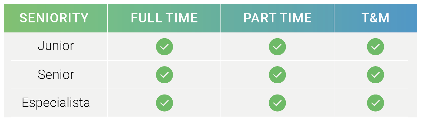 Adaptamos nuestros esquemas de servicio a las necesidades reales de tu negocio. Desde soporte operativo hasta consultoría experta, te ofrecemos perfiles Junior, Senior y Especialistas, con disponibilidad a tiempo completo o parcial.